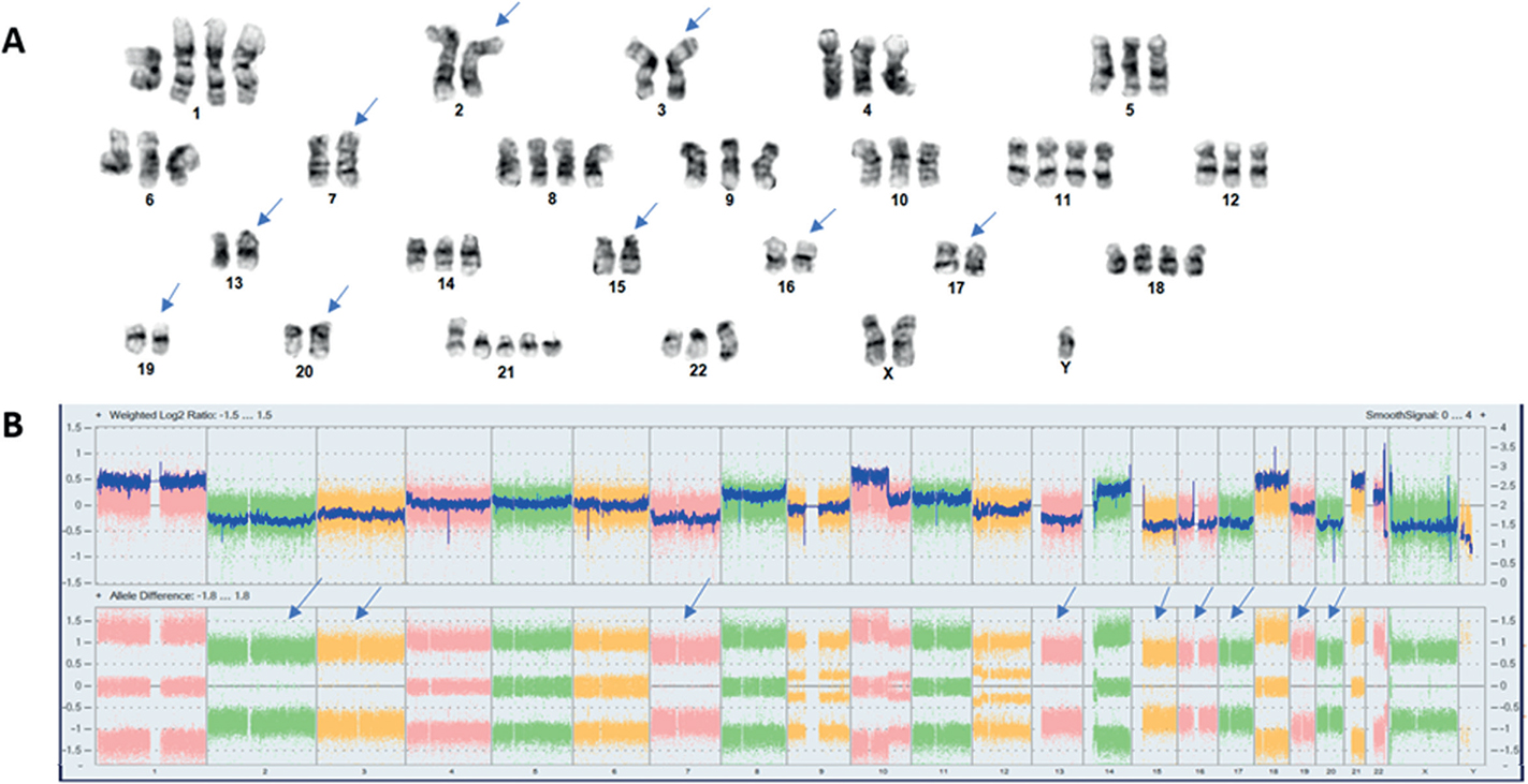 Figure 2. Doubled low hypodiploid B-ALL confirmed by microarray. A, A karyotype with 68 chromosomes which could be high hyperdiploid (good prognosis) or doubled low hypodiploid (poor prognosis). B, Microarray shows copy neutral loss of heterozygosity for the chromosomes with two copies (2, 3, 7, 13, 15, 16, 17, 19 and 20) (arrowed) confirming doubled low hypodiploid.
