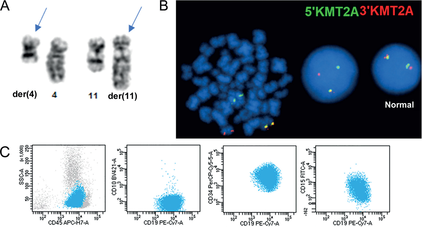 Figure 4. Cytogenetic and flow cytometry findings of B-ALL with KMT2A rearrangement. A, Conventional cytogenetic study shows t(4;11)(q21;q23). B, FISH analysis using KMT2A break-apart probes demonstrates KMT2A rearrangement. C, Flow cytometry study shows Pro-B-ALL immunophenotype and aberrant expression of CD15.