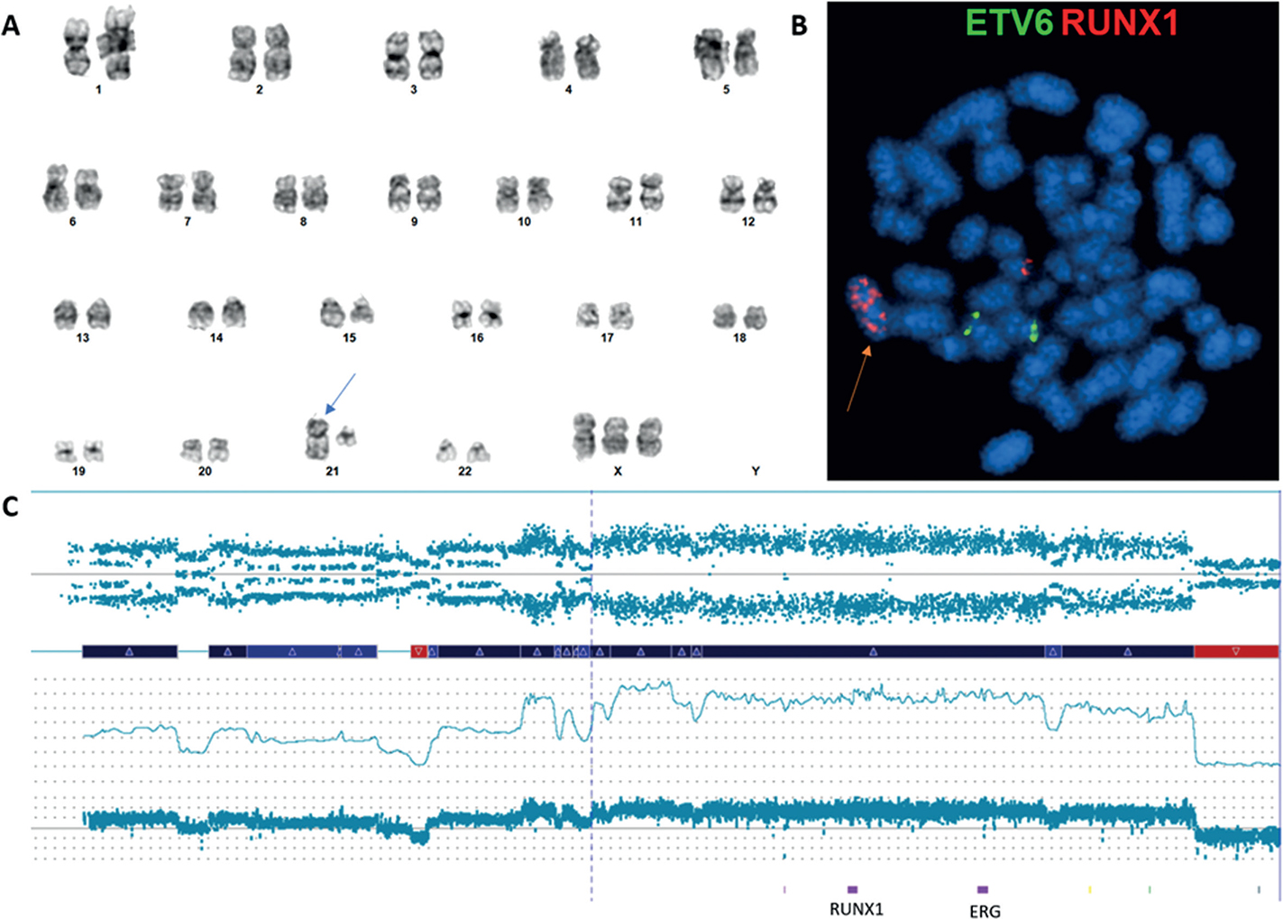 Figure 5. Intrachromosomal amplification of chromosome 21 (iAMP21). A, A big marker chromosome in the position of chromosome 21 with absence of a normal chromosome 21. B, Metaphase FISH shows the marker chromosome contains multiple copies of RUNX1 probes (red) consistent with RUNX1 amplification. C, Microarray shows complex structural abnormalities including amplification, gains, and deletions (across an approximately 11 Mb region).