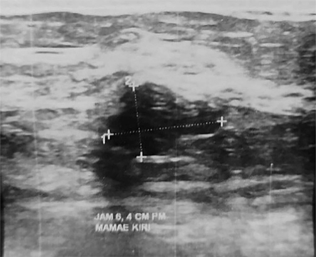 Figure 3. Irregular shaped mass with ill-defined margins on US imaging, suggested for malignant diagnosis of breast neoplasm. Image provided by Division of Oncology, Department of Surgery, Faculty of Medicine, Universitas Sumatera Utara.