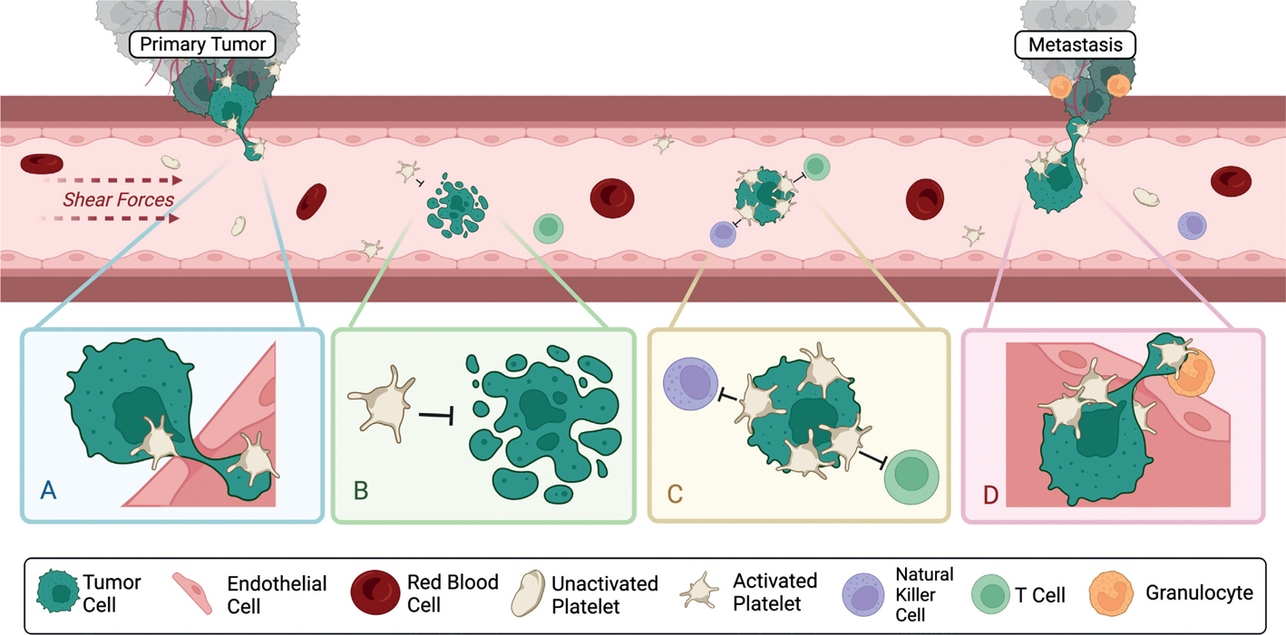 BC cells metastasize to distant organs by directly intravasating into blood vessels or indirectly entering into the lymphatic system which drains into the bloodstream (35). Upon hematogenous entry, an array of threats create a survival bottleneck for metastatic cells, and very few CTCs survive and successfully seed metastases (36). To survive these dangers, CTCs rapidly recruit platelets to provide physical protection and biochemical enhancements (37). In fact, platelets are the first cells in circulation to adhere to CTCs, forming microthrombi in seconds which then recruit fibrin, neutrophils, monocytes, and macrophages for additional aid (38).