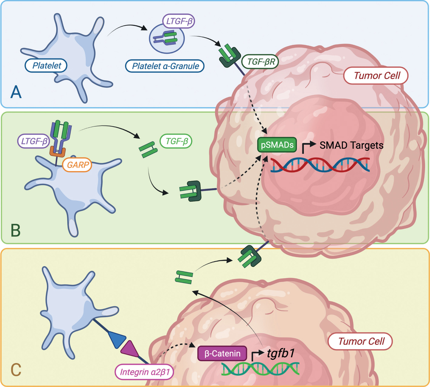 Figure 2. Platelets increase the local pool of active TGF-β. A, Platelets are the single greatest source of TGF-β in blood plasma, secreting huge amounts of latent TGF-β (LTGF-β) complexes in α-granules upon activation, which are then processed and activated by factors found on platelets and other cell types as shown in B (24). B, Platelets constitutively express the “Glycoprotein A Repetitions Predominant” (GARP) receptor, which docks LTGF-β (derived from platelets or other cell types) for activation. This substantially increases the local reservoir of active TGF-β (26). C, Direct contact between platelets and tumor cells via the cancer cell surface integrin α2β1 stimulates the Wnt-β-Catenin signaling pathway. This upregulates downstream transcription of tgfb1, resulting in increased TGF-β secretion by tumor cells (25). Active TGF-β secreted by platelets and tumor cells is bound by the TGF-β receptor on tumor cells, driving SMAD phosphorylation and downstream signaling that increases transcription of genes related to EMT, ECM remodeling, and more. TGF-βR, TGF-β receptor; pSMADs, phosphorylated “Suppressor of Mothers against Decapentaplegic” factors. Figure created with biorender.com