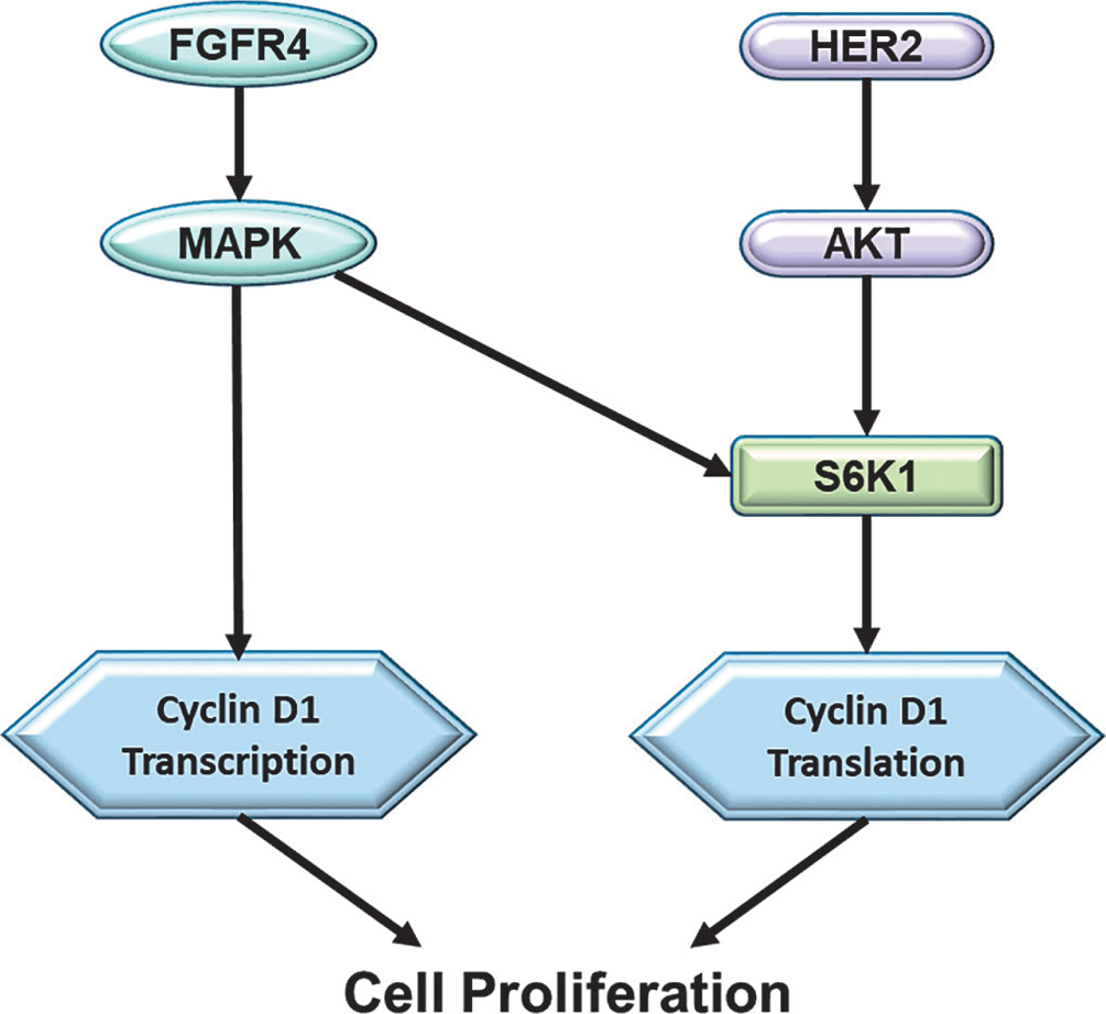 Figure 3. Model of regulation of cyclin D1 expression by collaboration between FGFR-4 and HER2 pathways leading to cell proliferation proposed by Koziczak and Hynes (61).