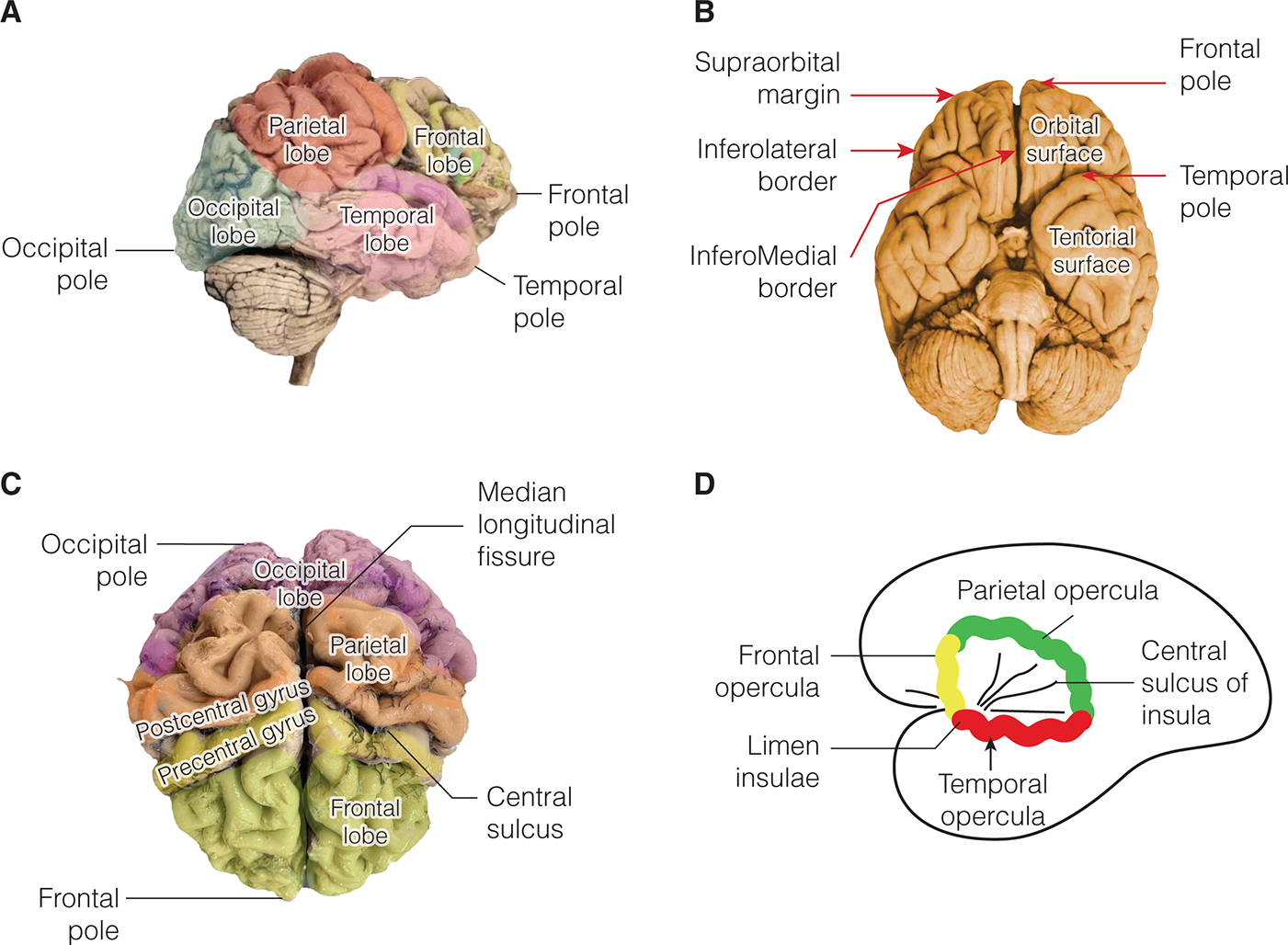 Figure 1. Borders, surfaces, poles, and lobes of the cerebral hemisphere. A, Superolateral surface. B, Inferior surface. C, Superior surface. D, Insular lobe.