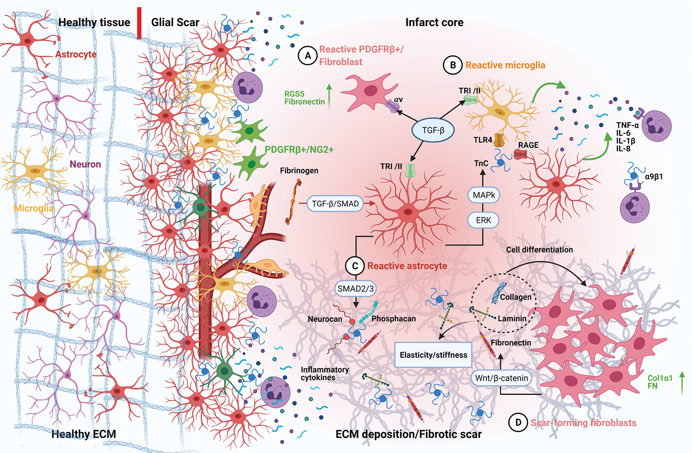 Figure 3. Fibrotic scar deposition by reactive neurovascular unit cells. Glial scar formation entails the deposition of fibrotic molecules at the injury core to prevent the infiltration of peripheral leukocytes and inflammatory signaling into the healthy tissue. A, Mural PDGFRβ+ cells give rise to scar-forming fibroblasts that migrate to the injury core and become a major source of fibrotic molecules. B, At the injury site, microglia respond to multiple signaling, including TGF-β and TnC to modulate the recruitment of peripheral immune cells and astrocyte activation. C, In turn, reactive astrocytes constitute the primary reservoirs of scar-forming TnC as well as CSPGs, which exert immunoregulatory roles and facilitate tissue replacement. Due to its high ligand capacity, TnC allows determining the action of distinct ECM molecules at the fibrotic scar. D, The abundant deposition of fibrotic proteins, including collagen, laminin, and fibronectin by fibroblast-like cells deriving from PDGFRβ+ cells that invade the lesion core, determines tissue elasticity and stiffness, and thus control neuronal plasticity inhibition or promotion balance.