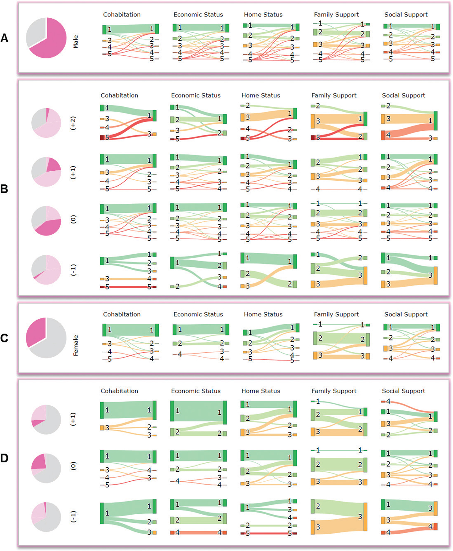 Figure 3. Patient social risk improvement levels for men (AB) and women (CD) from admission to discharge across the EVSF dimensions. The Sankey node colors indicate EVSF item score: 1 (green), 2 (sage-green), 3 (orange), 4 (dark orange) and 5 (red). A, Risk scoring variation at each EVSF items for all male patients in the studied cohort (160 patients). B, Breakdown of risk scoring variation at four improvement levels of social risk categories across each EVSF item of male patients. The patient distribution: (+2) 9 patients; (+1) 46 patients; (0) 99 patients and (−1) 6 patients. C, Risk scoring variation at each EVSF items for all female patients in the studied cohort (80 patients). D, Breakdown of risk scoring variation at three improvement levels of social risk categories across each EVSF item of female patients. The patient distribution: (+1) 18 patients; (0) 56 patients and (−1) 6 patients.
