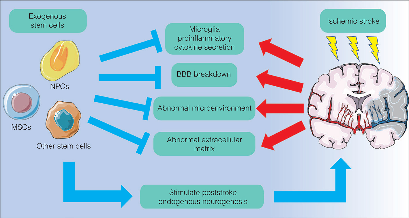Figure 4. Transplanting exogenous stem cells supports a beneficial stroke outcome. Several pathological processes are involved in the chronic stroke phase such as blood-brain barrier (BBB) breakdown, abnormal extracellular matrix formation, and proinflammatory factors secretion from microglia, creating a hostile microenvironment that hampers neurogenesis. Exogenous stem cell transplantation can inhibit microglia activation, increase the integrity of the BBB, and form a suitable microenvironment for neurogenesis. Interestingly, the majority of exogenous stem cells do not replace damaged tissue, suggesting that exogenous stem cells act in a paracrine way. MSCs, mesenchymal stem cells; NPCs, neural progenitor cells.