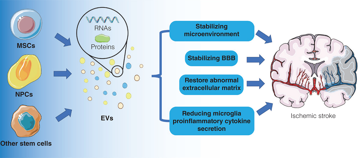 Figure 5. Stem cell-derived EVs stimulate poststroke neuroregeneration. Stem cell-derived extracellular vesicles (EVs) yield similar effects as exogenous stem cells under stroke conditions. Stem cell-derived EVs stabilize the extracellular microenvironment and enhance the integrity of the blood-brain barrier (BBB). They also reduce the proinflammatory factors secretion of microglia, contributing to a restoration of the former abnormal extracellular matrix. Abbreviations: NPCs, neural progenitor cells; MSCs, mesenchymal stem cells.