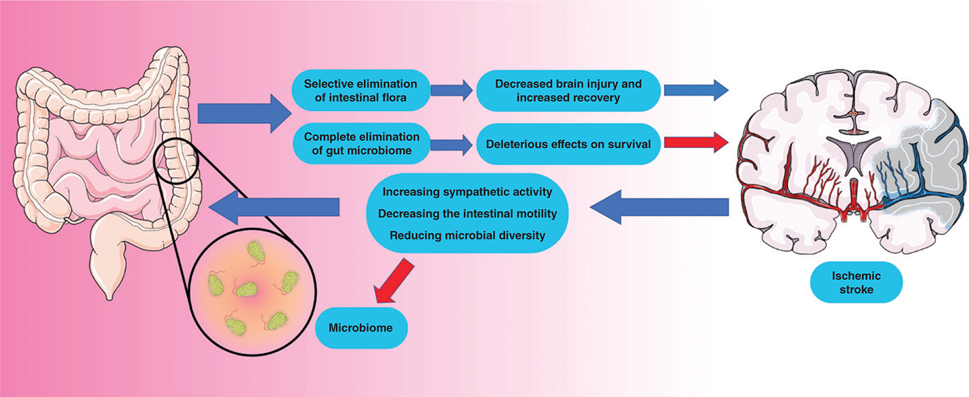 Figure 3. An overview of the gut-brain-axis after stroke. After brain injury, the gut microbiome is altered and in turn modulates stroke outcome via modulation of postischemic inflammatory responses. Stroke has been shown to affect the gut microbiome composition and diversity via increased sympathetic activity, decreasing the intestinal motility, and inducing dysbiosis. Selective removal of a certain population of intestinal bacteria has a beneficial effect on poststroke recovery. However, the complete removal of the intestinal flora has had a detrimental effect on stroke prognosis. The precise mechanisms of the gut-brain-axis after stroke are still unclear.