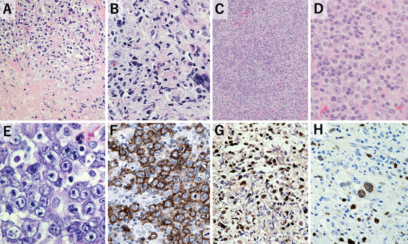 Beneath the ulcer, a dense polymorphic infiltrate with variable number of plasma cells, histiocytes, and eosinophils are scattered. A substantial number of large, transformed cells resemble either atypical immunoblasts or Hodgkin/Reed-Sternberg cells (38). Angioinvasion and necrosis can be present (38, 39). The large transformed immunoblasts and Hodgkin/Reed-Sternberg-like cells are variably positive for CD20. These cells show activated-B-cell phenotype and are CD30-positive. EBV is consistently positive for LMP1, with transformed cells commonly positive for EBER (37). Clonal IG gene rearrangements are proven in fewer than 50% of cases. The clinical course is rather benign compared to other EBV-related disorders. Spontaneous regression is possible, responding to reduction or discontinuation of immunosuppressive therapies.