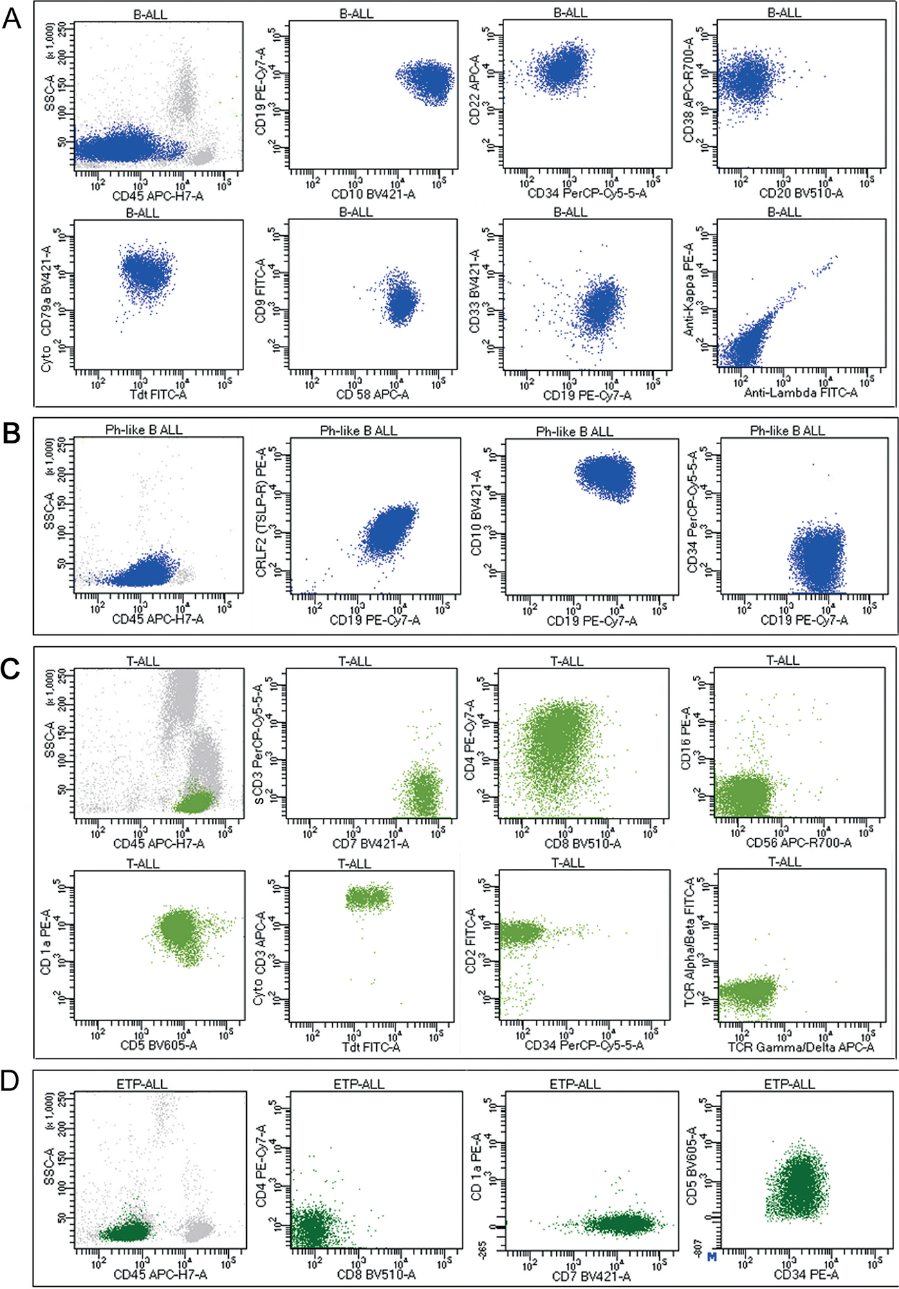 Figure 2. Acute lymphoblastic leukemia. Representative dot plots of acute lymphoblastic leukemia (ALL). A, Precursor B-cell ALL (B-ALL, blue) showing low side scatter, dim to negative CD45, expression of CD19, CD10, CD34, CD22, CD38, cytoplasmic (Cyto) CD79a, TdT, CD9, CD58, CD33, and no expression of CD20, kappa, and lambda. B, Philadelphia-like (Ph-like) B-ALL (blue) showing expression of CRLF2. C, T-cell ALL (T-ALL, green) showing low side scatter, intermediate to bright CD45, expression of CD7, CD4, CD8, CD1a, CD5, Cyto CD3, TdT, CD2, and no expression of surface CD3 (sCD3), CD16, CD56, CD34, TCR alpha beta, and TCR gamma delta. D, Early-T-precursor (ETP) ALL (dark green) being positive for CD7, CD34, CD5 (dim and partial), CD45 (dim to negative), and negative for CD4, CD8 and CD1a.