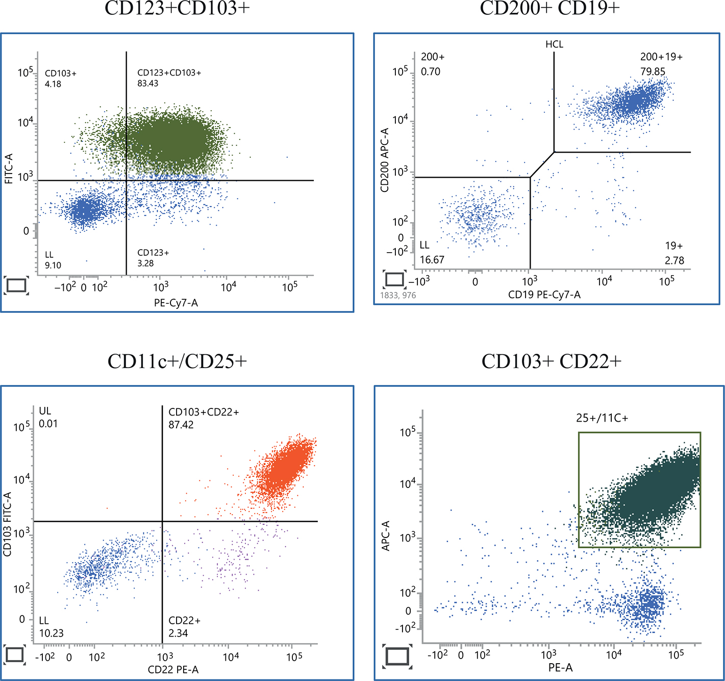 Figure 4. Classic HCL-phenotype on flow cytometry: CD11c+, CD103+, CD123+CD22+, CD25+, CD200+ cells.