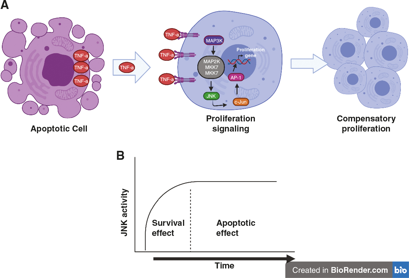 Figure 1. Mitogenic effect of apoptotic cells on neighboring cells. A, During the process of cell death by apoptosis, cells release mitogenic proteins such as TNF-alpha. This signal is received by neighboring cell receptors that activate various kinases which promote cell proliferation and survival. B, The effect of the JNK pathway is shown throughout the activation time, having an apoptotic effect in long times and favoring survival in acute activation times.