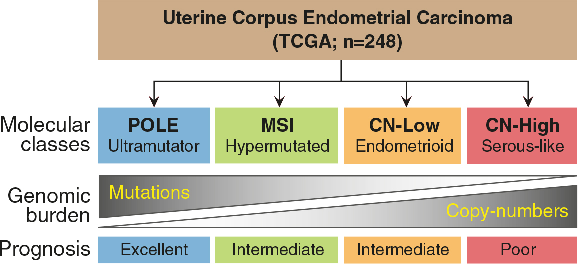 Figure 2. Molecular classes of endometrial cancer based on cancer genome characterization from TCGA. Extensive genomic characterization of cancer genomes from the TCGA endometrial cancer study (20) has suggested a new and improved stratification scheme for endometrial cancer. The four molecular subtypes (POLE/MSI/CN-low/CN-high) groups have distinct genomic and molecular characteristics, including differences in somatic mutations and copy-number burdens, and importantly, prognostic differences.