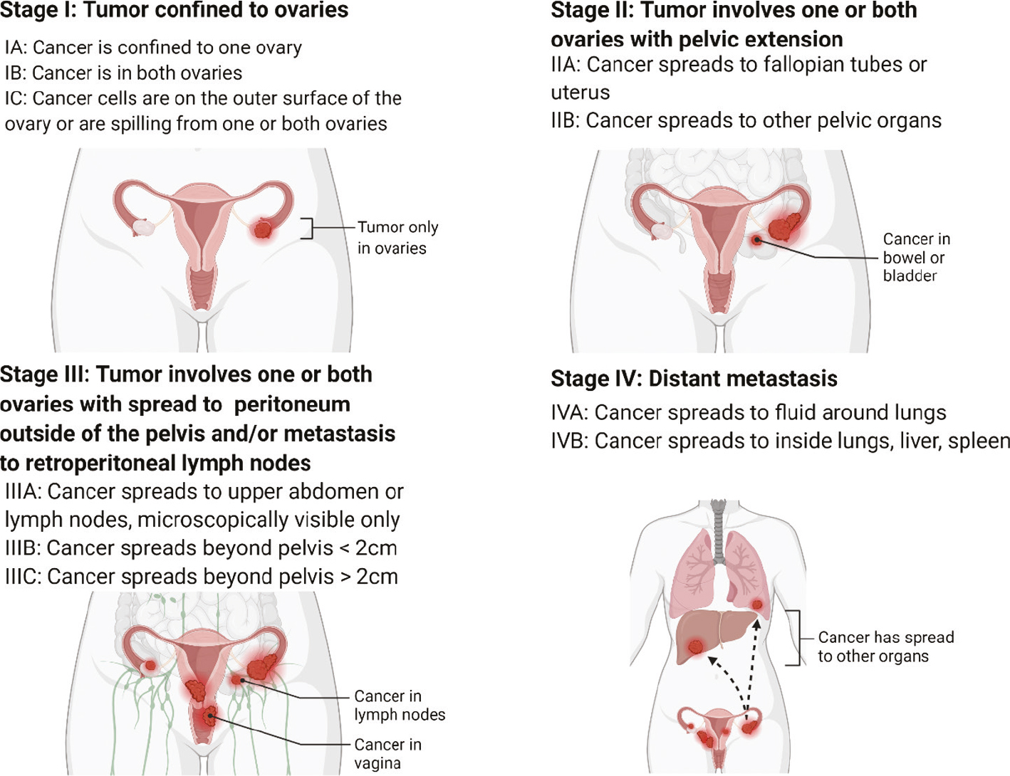 Figure 1. Stages of ovarian cancer. Adapted from “Ovarian Cancer Staging,” by BioRender.com (2022). Retrieved from https://app.biorender.com/biorender-templates. Created with BioRender.com. Used under BioRender’s Academic License Terms.