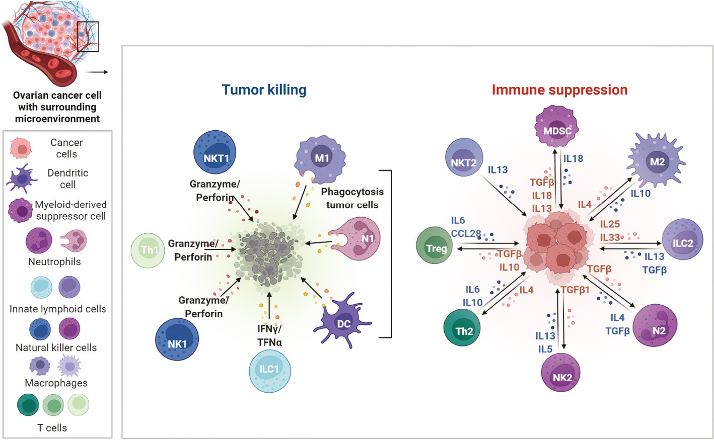 Figure 3. Components of omental tumor microenvironment. Adapted from “Tumor Microenvironment with Callout (Layout),” by BioRender.com (2022). Retrieved from https://app.biorender.com/biorender-templates. Used under BioRender’s Academic License Terms.