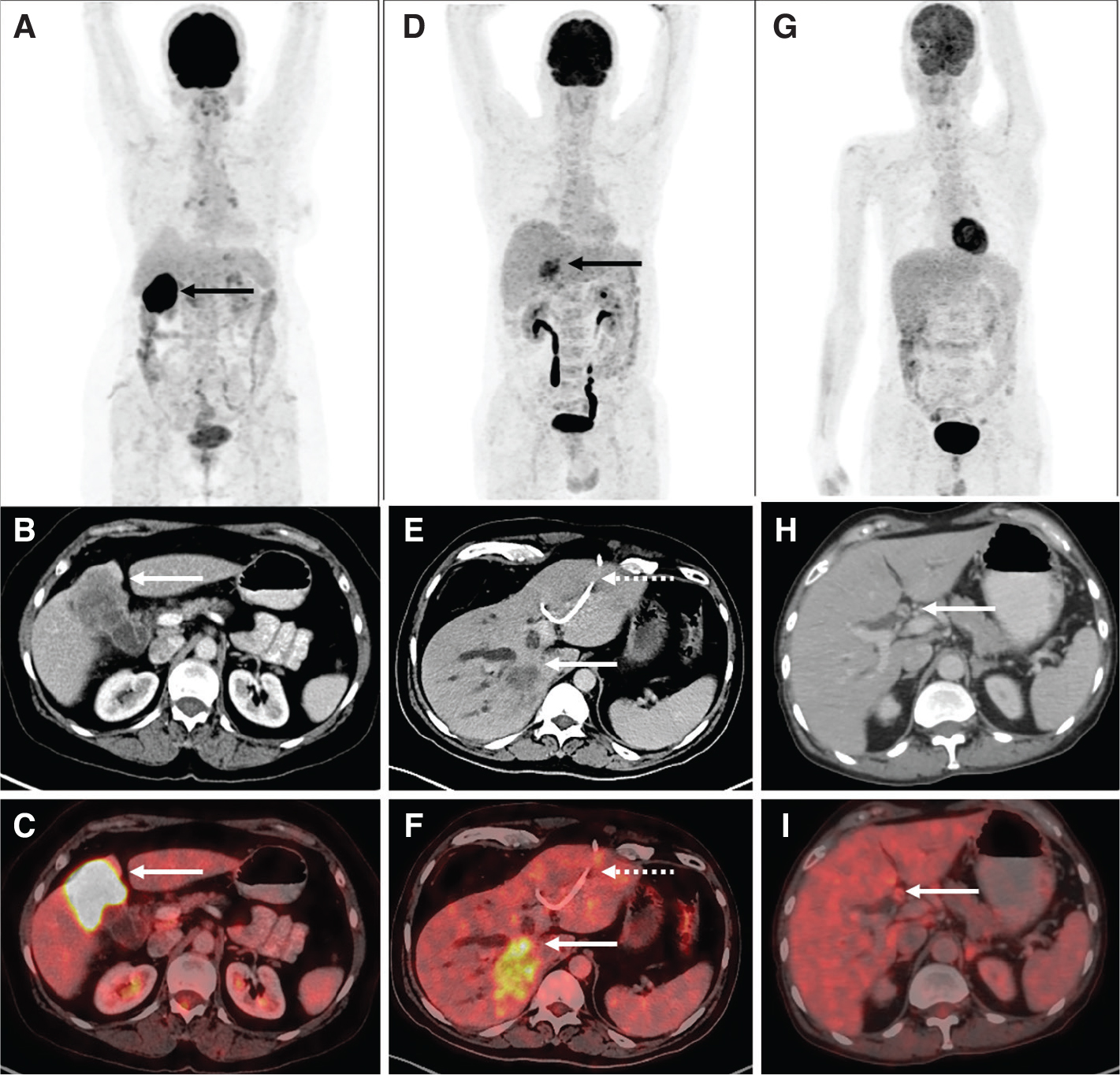 Figure 3. 18F-FDG PET/CT in biliary tract cancers: A) Maximum Intensity Projection (MIP) image showing focal intense tracer uptake in the region of the gallbladder fossa (black arrow). Corresponding CT (B) and fused PET/CT (C) images show intensely tracer avid (SUVmax 28.7) heterogeneously enhancing mass lesion arising from the fundus and body of the gallbladder with local invasion (Gallbladder carcinoma) (white arrows). D) MIP image showing tracer uptake in the region of the liver (black arrow) with corresponding CT (E) and fused PET/CT (F) images showing 18F-FDG avid (SUVmax 11.2) hypodense lesion in the right lobe of liver (white arrows) causing intrahepatic biliary radical dilatation suggestive of intrahepatic cholangiocarcinoma along with percutaneous transhepatic biliary duct stent in situ in the left ductal system (dotted arrows). G) MIP image with no abnormal focus of uptake seen anywhere in the region of the liver. Corresponding CT (H) and fused PET/CT (I) images show faintly tracer avid biliary ductal thickening (SUVmax 5.1) in the hilar region with tracer uptake similar to background liver uptake suggestive of hilar cholangiocarcinoma.