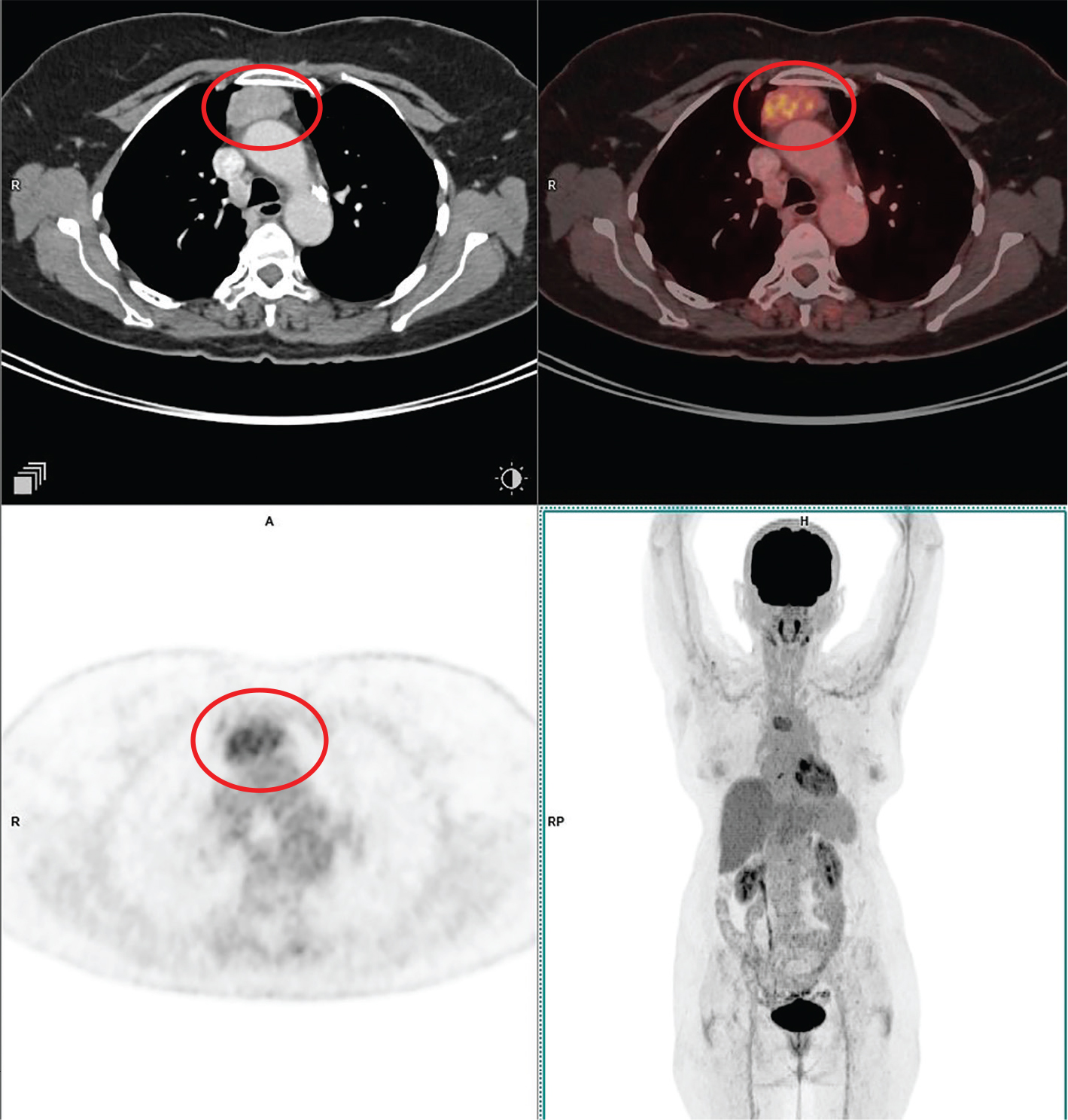 Figure 1. Type A thymoma. Anterior mediastinal mass that was pathologically confirmed as type A thymoma. FDG PET/CT images include axial CT (top left panel), fused axial PET/CT (top right panel), axial PET (bottom left panel), and maximum intensity projection (MIP) PET image (bottom right panel). In the red circle, there is a soft tissue density mass with well-defined contour showing homogenous enhancement in CT with moderate FDG uptake on PET. No evidence of infiltration of adjacent structures. No other metabolically active disease in the whole-body survey.