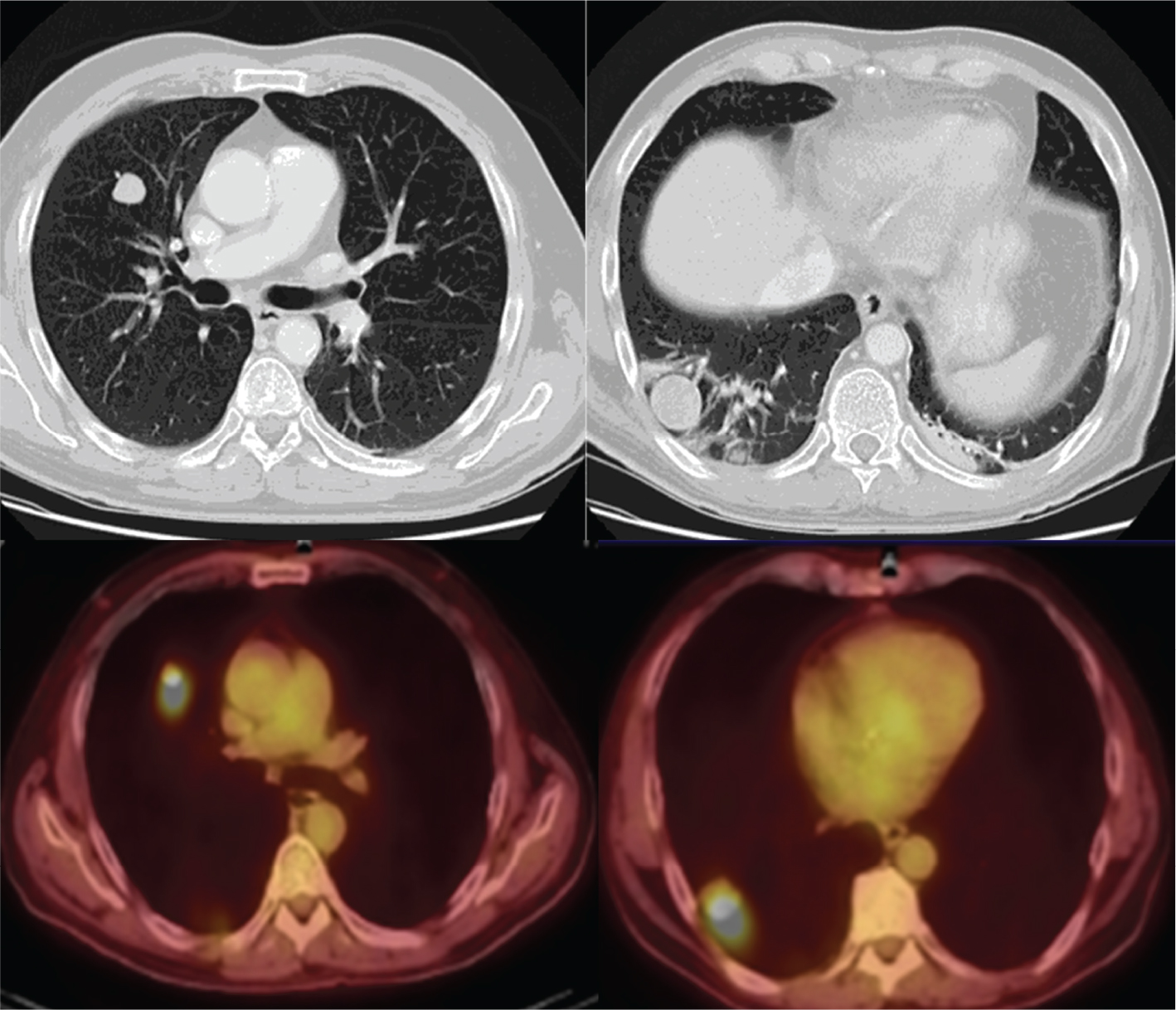 Figure 5. Pulmonary nodules. FDG PET/CT demonstrates hypermetabolic activity within two right lung pulmonary nodules. This patient was status post left testicular mass resection revealing a nonseminomatous germ cell tumor with pathologic staging of pT4 Nx Mx. Findings on PET/CT were consistent with pulmonary metastases resulting in final staging of T4 N0 M1.