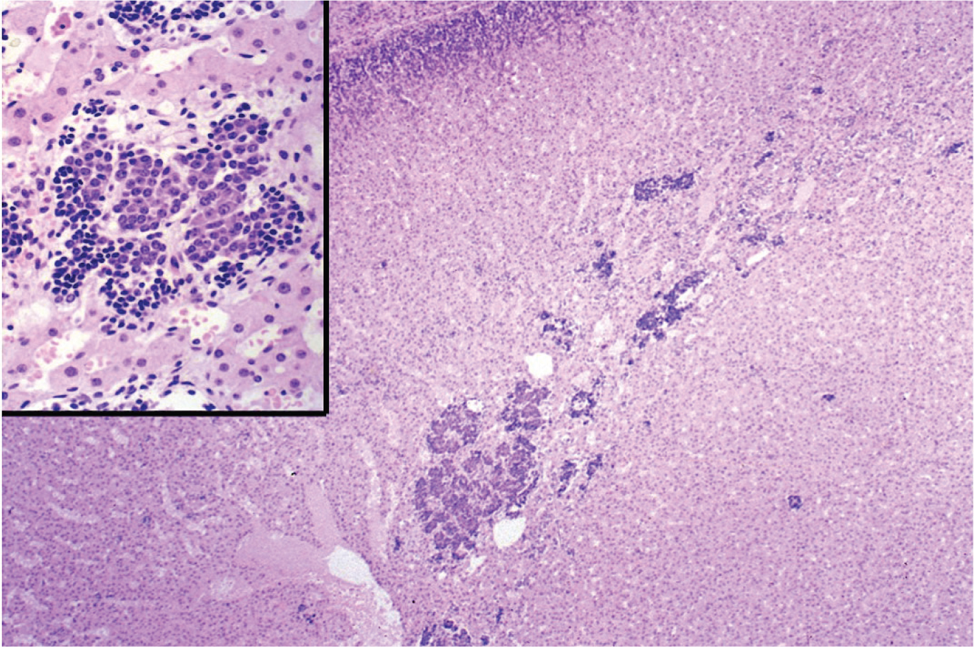 Figure 1. Neuroblastoma. Photomicrograph showing an overview and a high-power magnification of an in situ neuroblastoma illustrating the undifferentiated small round blue cell tumors in clusters exhibiting a high nucleus-cytoplasm ratio. The image is from the Neuroblastoma Atlas by the International Neuroblastoma Pathology Committee. Courtesy of Professor Hiroyuki Shimada, Department of Pathology, Stanford University, CA, USA.