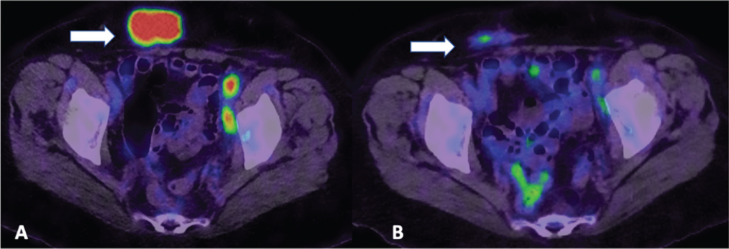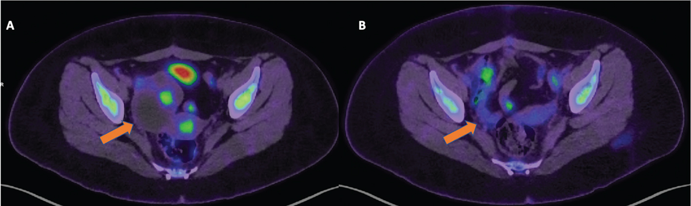 Figure 2. Restaging. FDG PET/CT images obtained from a 19-yr-old patient with atypical serous ovarian carcinoma referred for restaging following a unilateral oophorectomy and a cystectomy. Image A demonstrates a right-sided malignant ovarian tumor with focal areas of increased FDG accumulation on pre-treatment FDG PET/CT, which demonstrates significant post-treatment improvement in Image B.