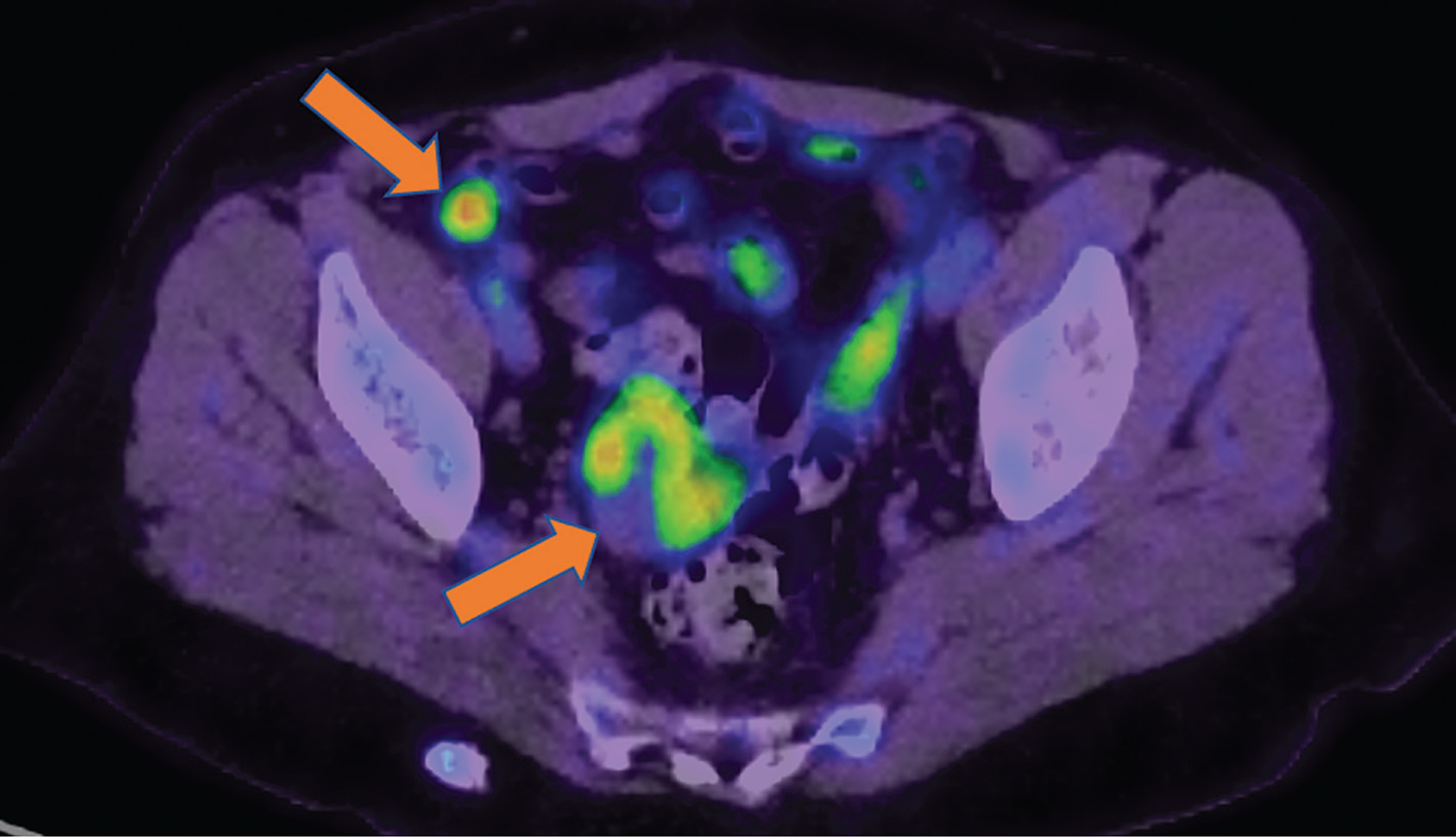 Figure 3. Restaging. 18F-FDG PET/CT images obtained from a 69-yr-old patient with Stage IIIC ovarian carcinoma, post debulking surgery and completion of 3rd line chemotherapy, referred for restaging (in the absence of baseline imaging). Arrows indicate the metabolically active primary ovarian tumor in the right adnexa and a right-sided metastatic iliac lymph node.