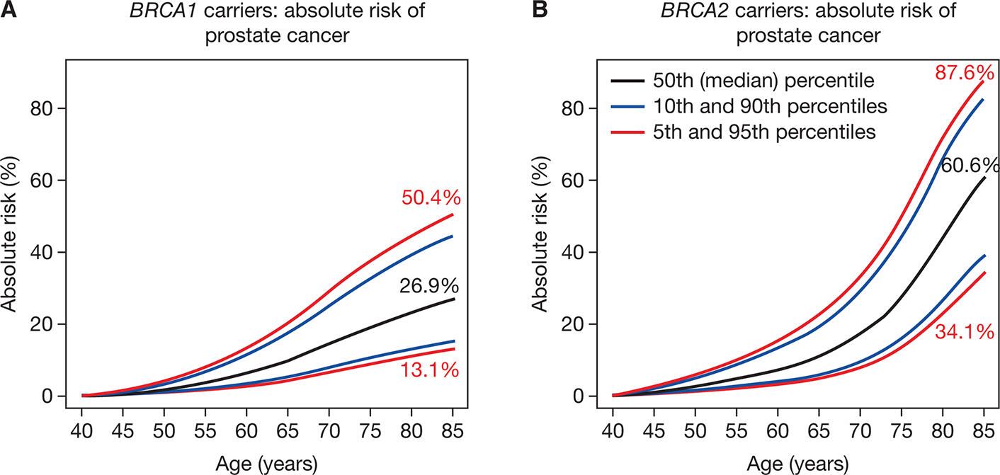 Figure 1. Risk of prostate cancer in BRCA1/2 mutation carriers according to age and polygenic risk. Reproduced from Barnes et al (64). The predicted absolute risks of developing breast cancer and prostate cancer by PRS percentile. Risks were calculated assuming the per standard deviation ratio estimates in the combined sample of BRCA1 and BRCA2 carriers. (B) absolute risk of prostate cancer in male BRCA1 carriers (C) absolute risk of Prostate cancer in male BRCA2 carriers. Copyright@2021, Oxford University Press. Figure reproduced under terms of the Creative Commons CC BY license which permits unrestricted use, distribution, and reproduction in any medium.