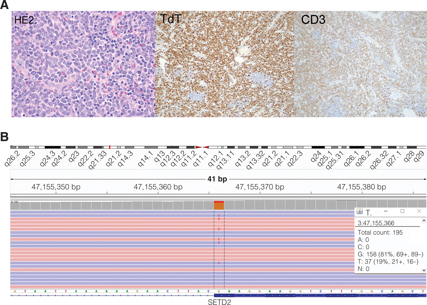 Figure 2. Histopathology and SETD2 mutation of a T lymphoblastic lymphoma case. A, Hematoxylin and eosin-stained section shows sheets of medium to large-sized atypical lymphoid cells with round, oval or irregular nuclei, fine nuclear chromatin, distinct one or multiple nucleoli and scant cytoplasm. Mitosis is easily seen. The tumor cells are positive for CD3 and TdT. B, Next generation sequencing (whole exome sequencing with an average depth of coverage of 489x) shows a pathogenic loss-of-function mutation: c.4715 C>A (p.Ser1572*) at a VAF of 19% in SETD2.