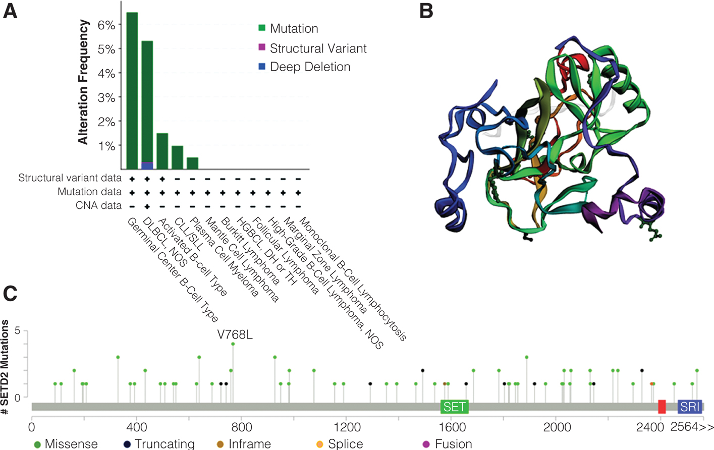 Figure 3. Genetic alterations of SETD2 in mature B-cell lymphomas. Data were retrieved from cBioPortal (http://www.cbioportal.org) in October 2021, including 3338 patients/samples from 10 studies. A. Frequency of SETD2 gene alterations in various types of mature B-cell lymphomas. B, Cartoon crystal structure of SETD2 bound to histone h3.3 k36i peptide. The protein is colored with a rainbow gradient from red (N-terminus) to blue (C-terminus). Mutation types and corresponding color codes are as follows: dark green— missense mutations; black— truncating mutations; brown— inframe mutations. C, Schematic representation of SETD2 mutations associated with mature B-cell lymphomas. Mutation diagram circles are colored with respect to the corresponding mutation types. In case of different mutation types at a single position, color of the circle is determined with respect to the most frequent mutation type. CLL/SLL, chronic lymphocytic leukemia/small lymphocytic lymphoma; DLBCL, diffuse large B-cell lymphoma; SET, Su(var)3-9, enhancer-of-zeste and trithorax; SRI, Set2 Rpb1 interacting.