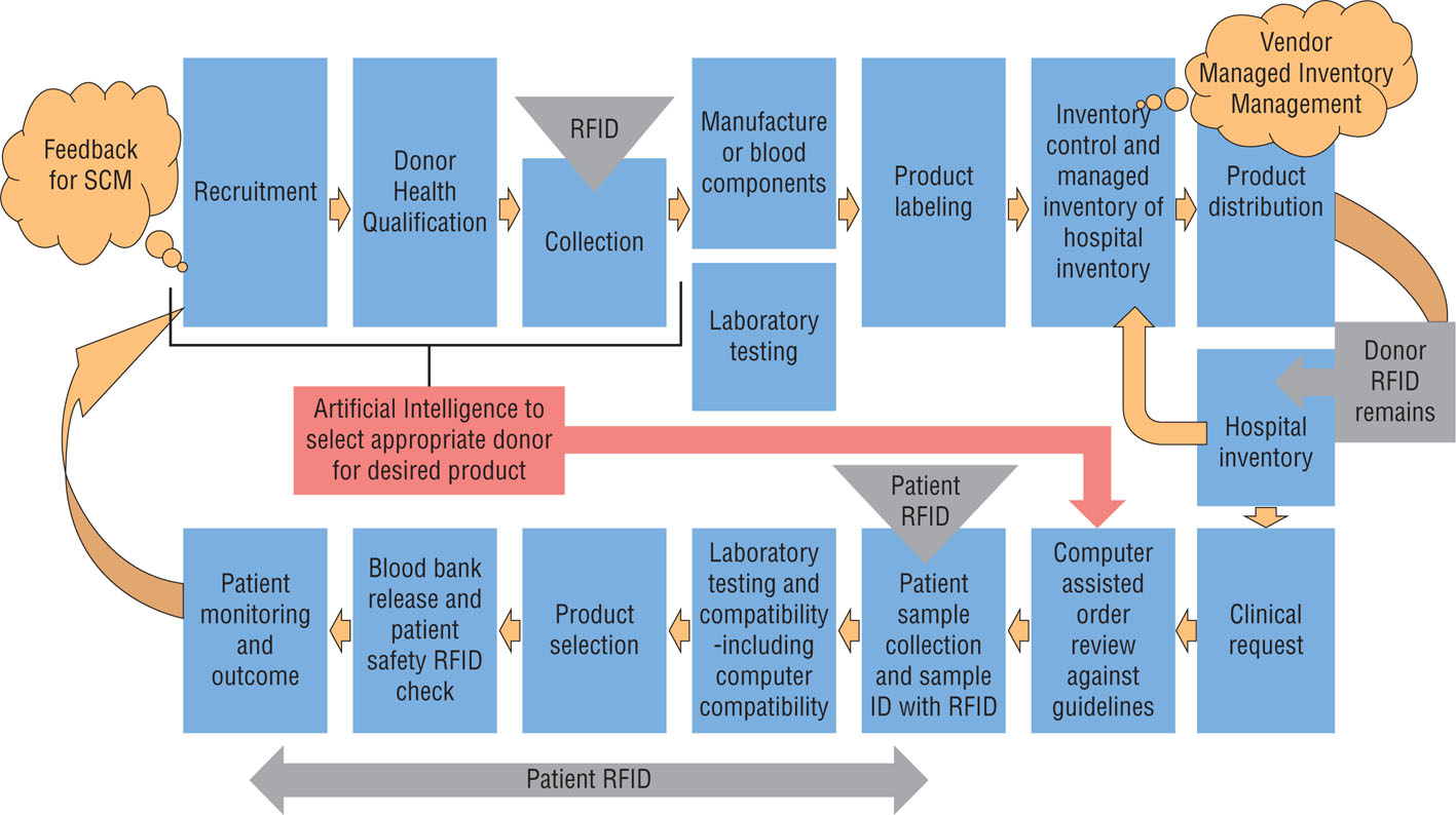The implementation of digital footprint to achieve universal quality data collection and management in the hospital could reduce or prevent errors when completing a physician’s order using AI and RFID for specimen tracking, identification, and labelling. Also, it could help avoid ‘wrong blood in tube’, inappropriate transport (cold chain) and crossmatch errors, and identify bedside problems (‘is this the right product for the right patient at the right time’?). Digital transfusion potential could create significant financial savings through an integrated vein-to-vein system, a well-functioning clinical interface.